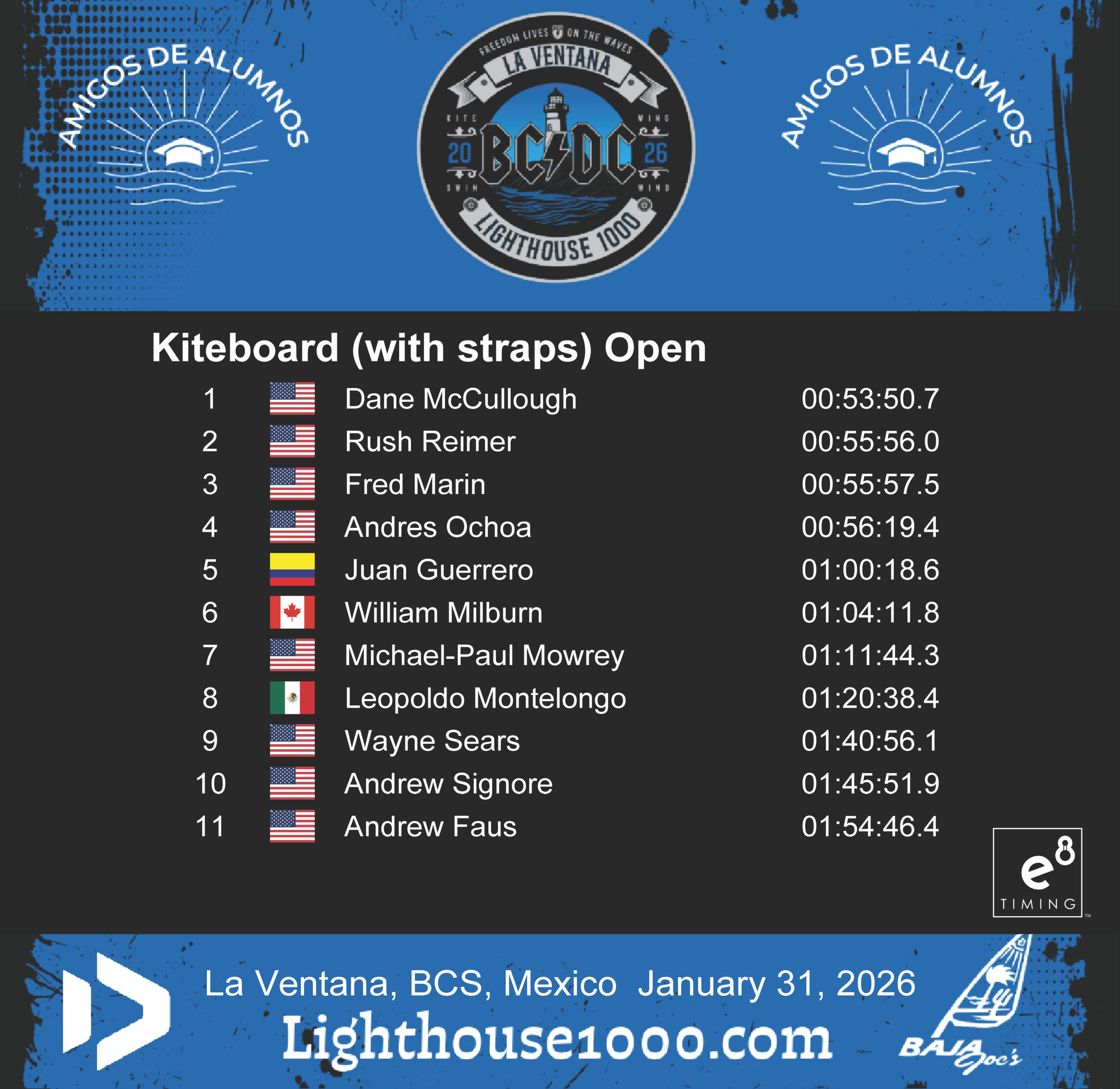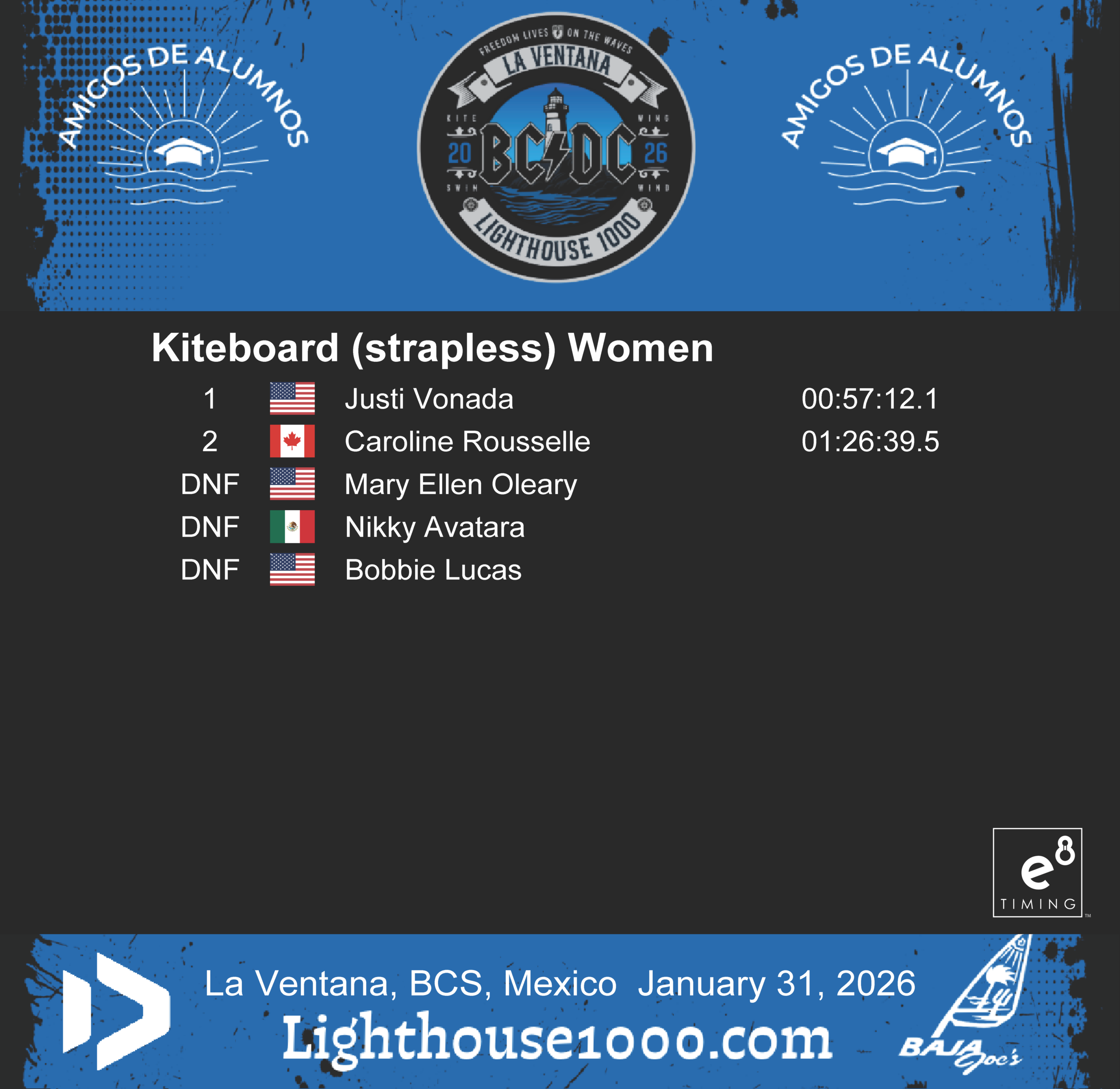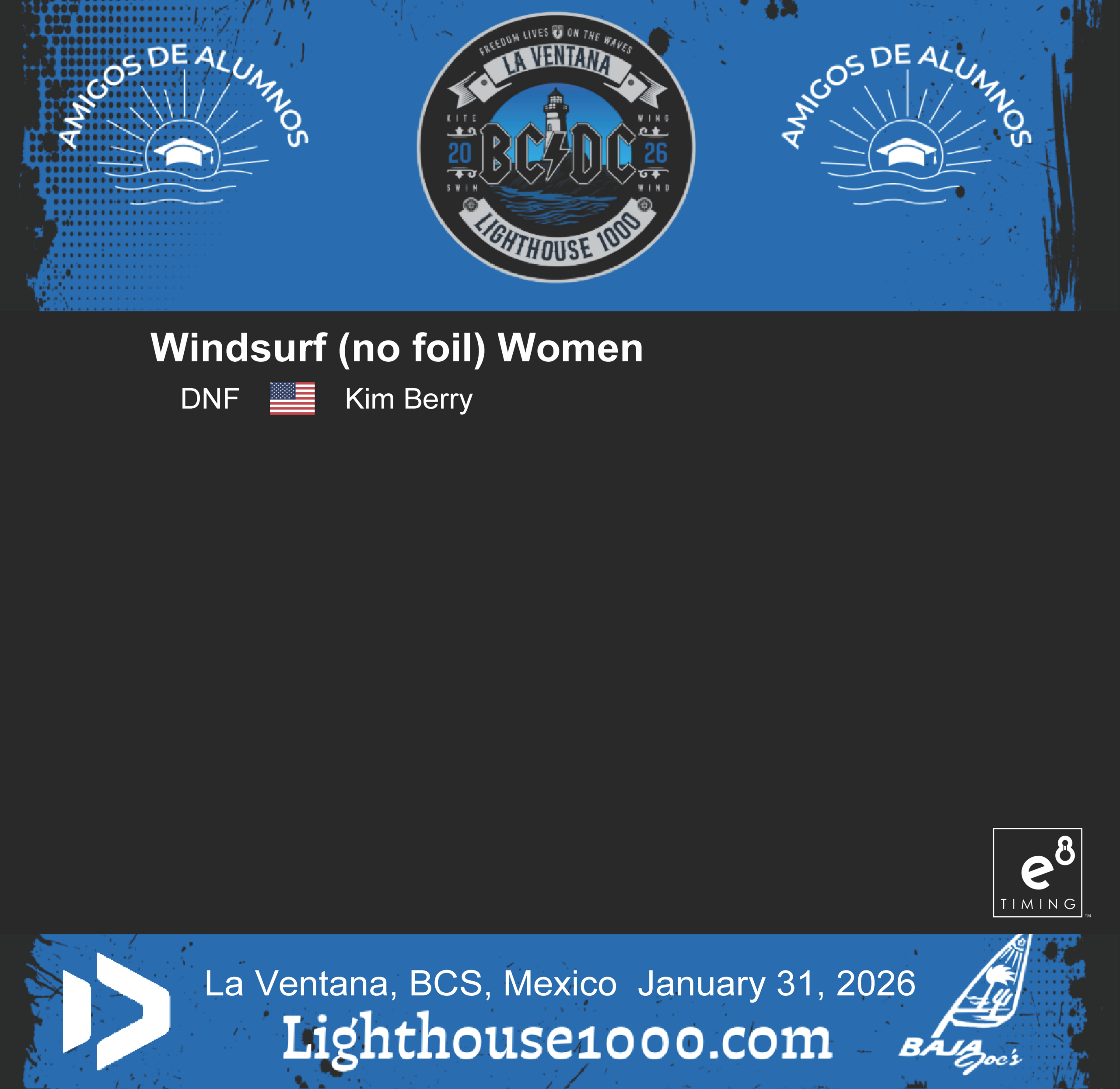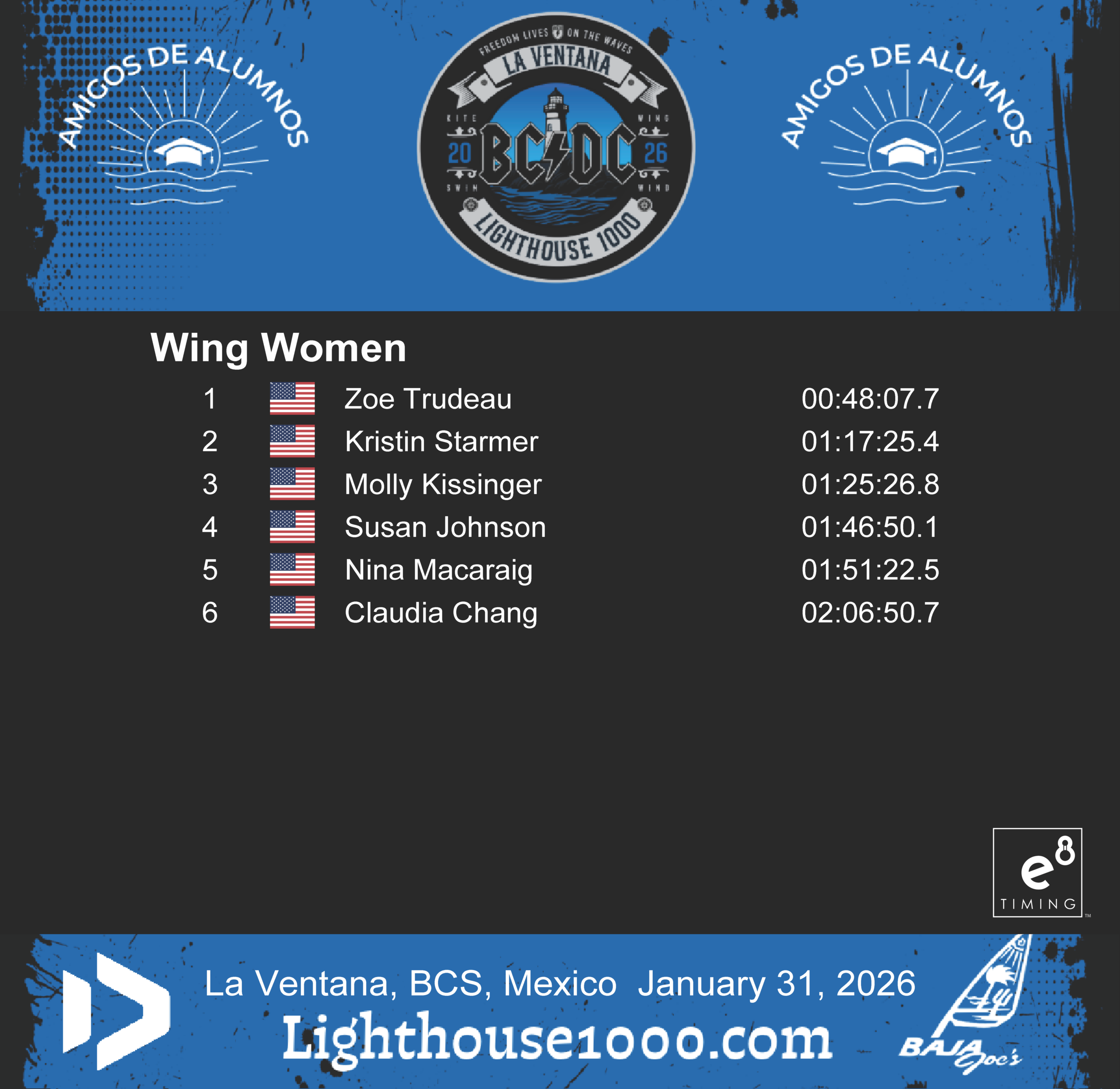 Results are powered by E8 Timing. Our friends Blair and Staci provide live tracking that records and delivers instant results for the Lighthouse 1000 Race.