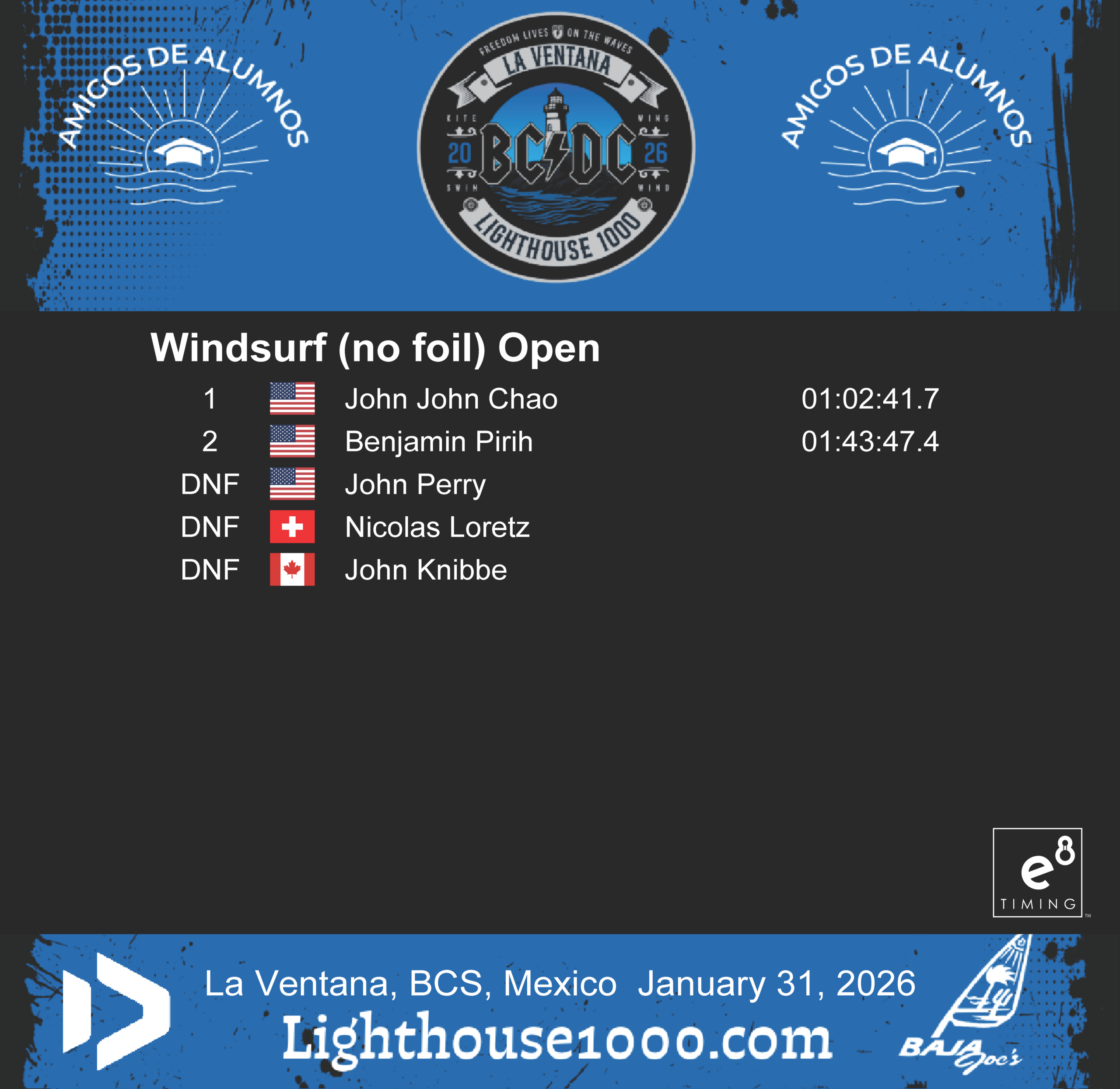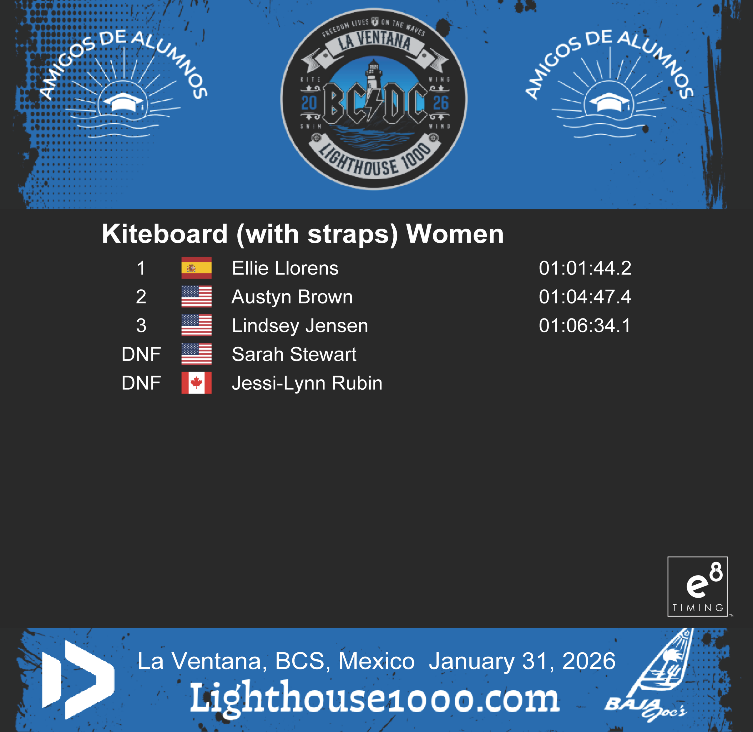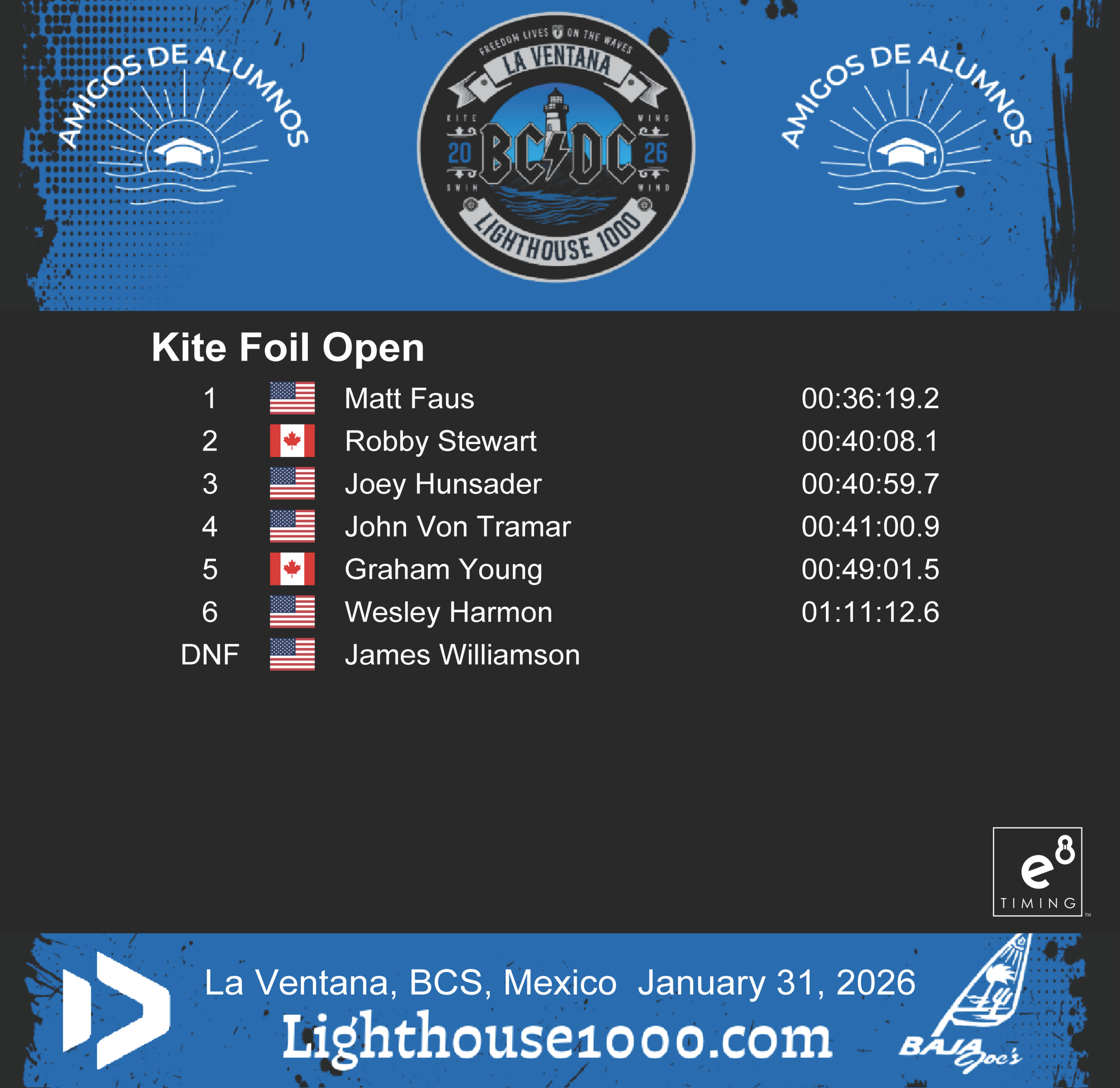 Results are powered by E8 Timing. Our friends Blair and Staci provide live tracking that records and delivers instant results for the Lighthouse 1000 Race.