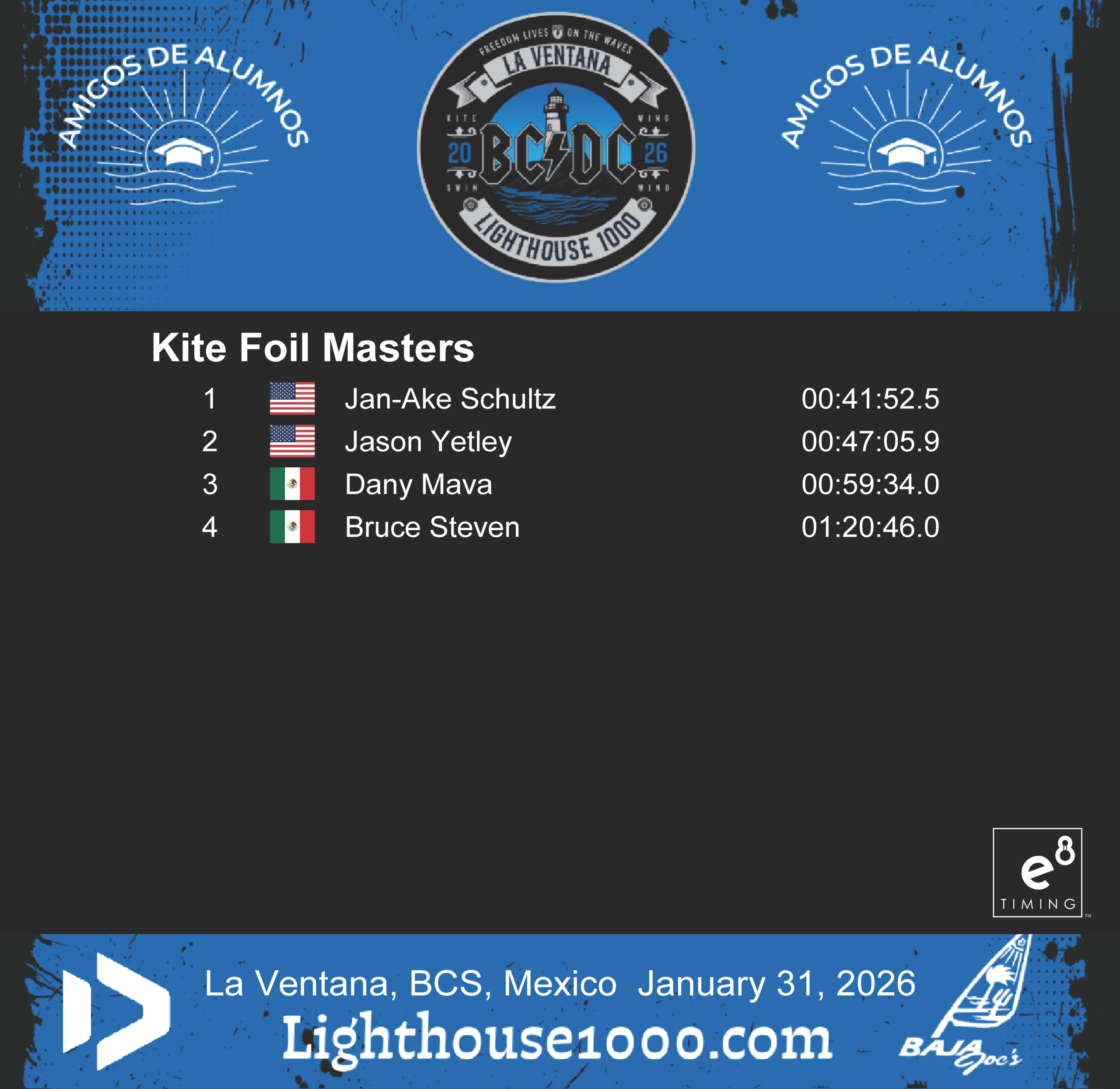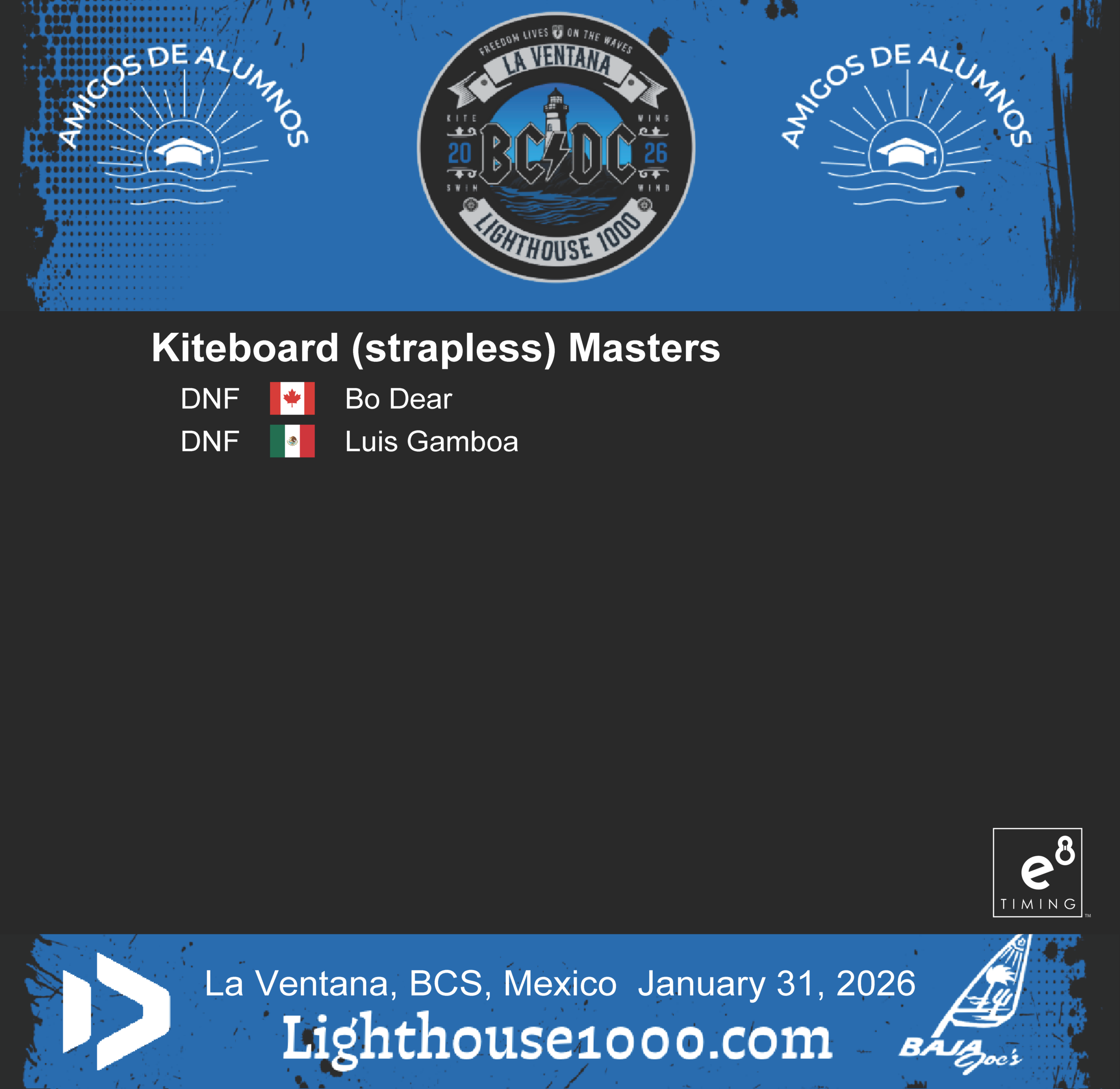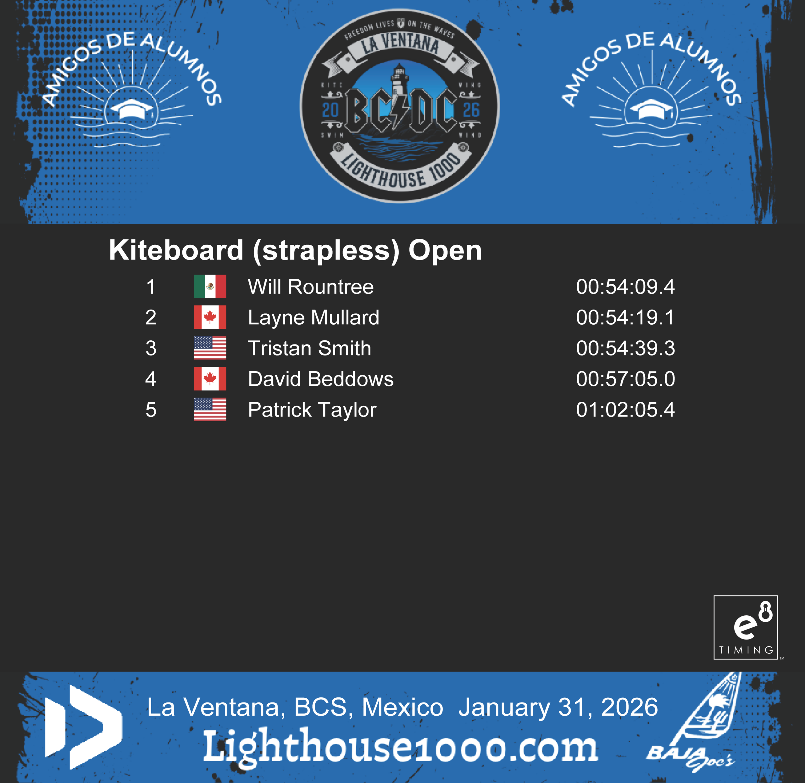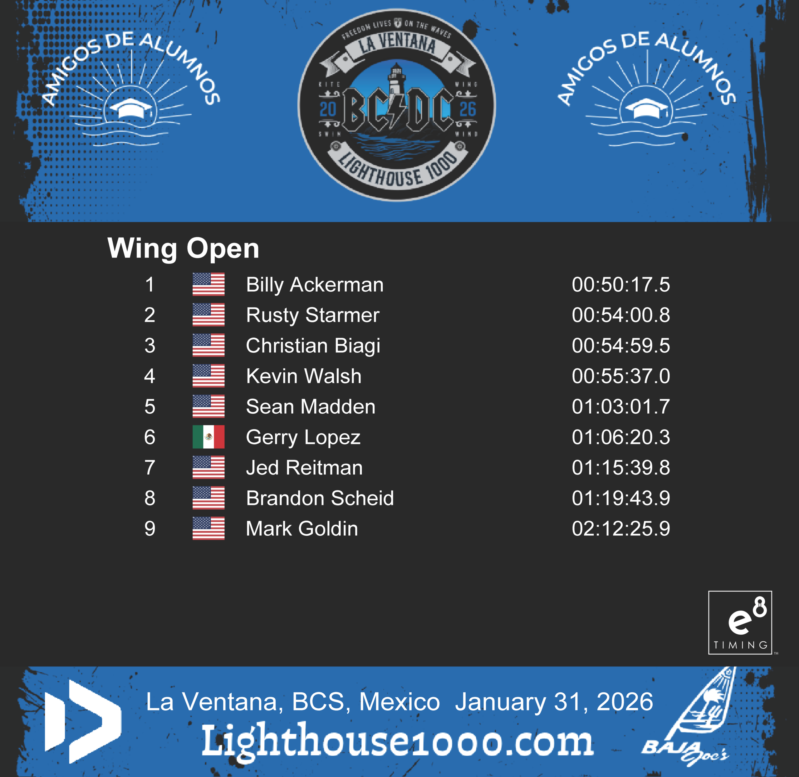 Results are powered by E8 Timing. Our friends Blair and Staci provide live tracking that records and delivers instant results for the Lighthouse 1000 Race.